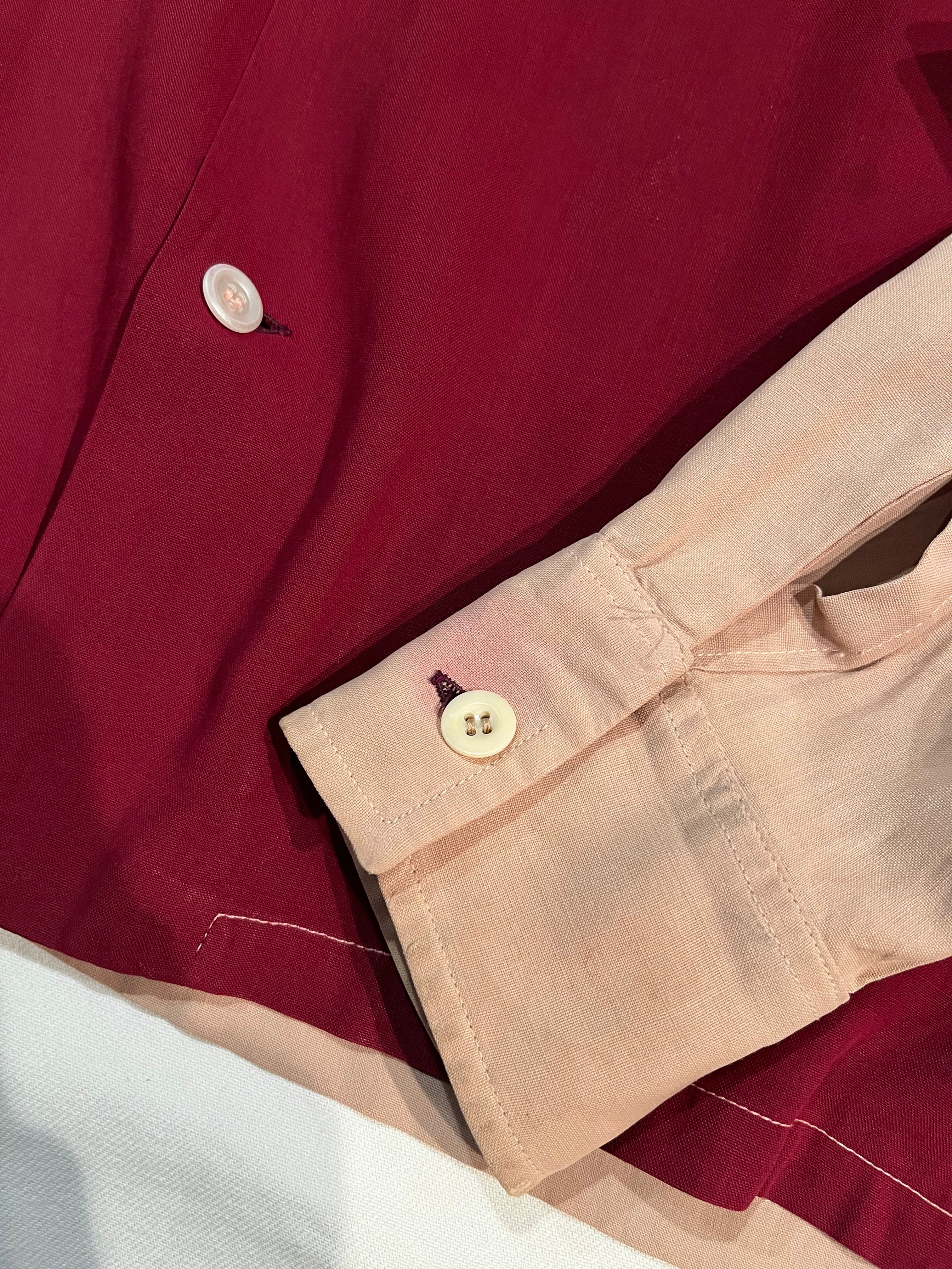 バーガンディ×ピンクベージュのロカビリーなカラーリングのレーヨンシャツ
