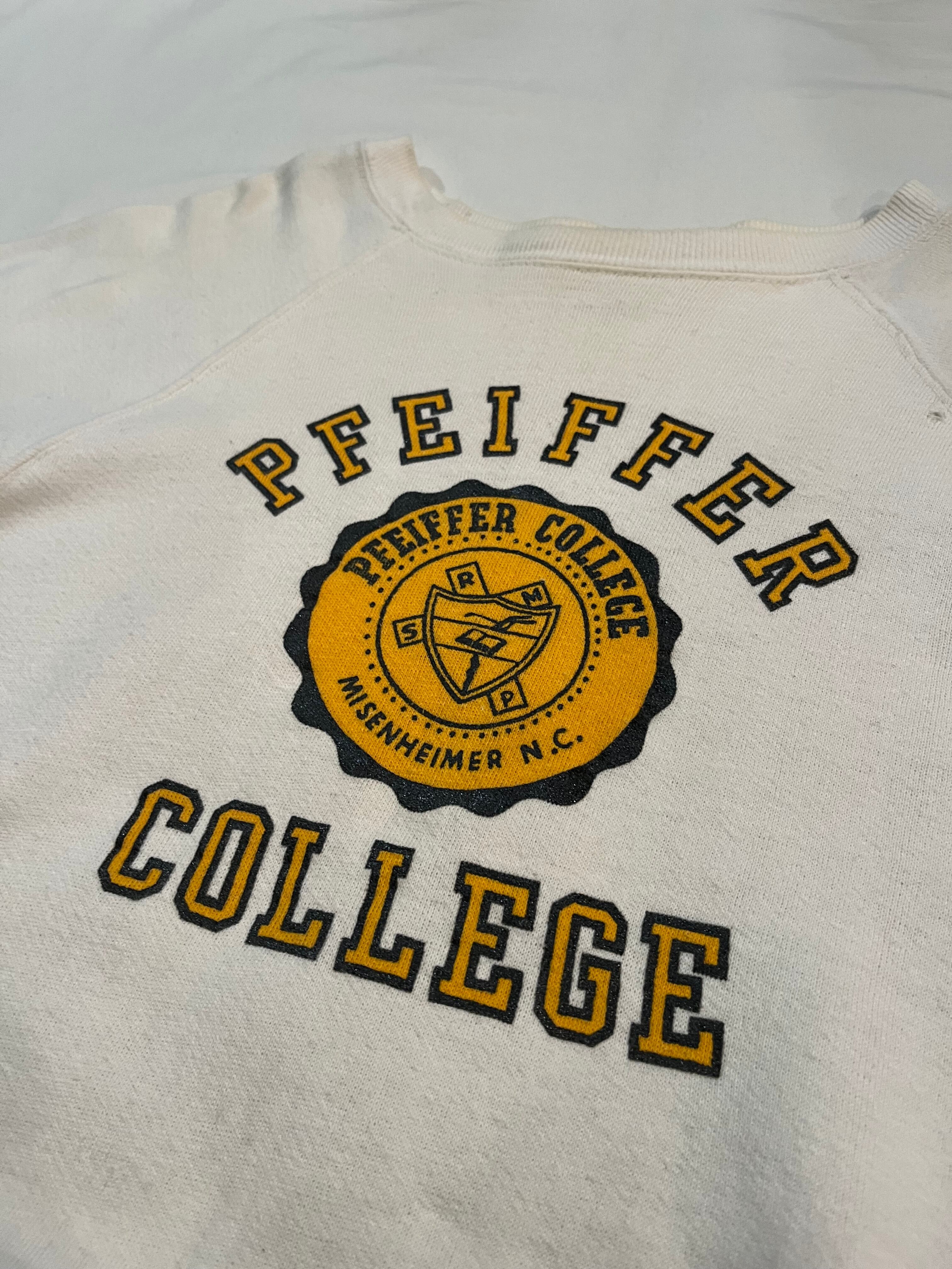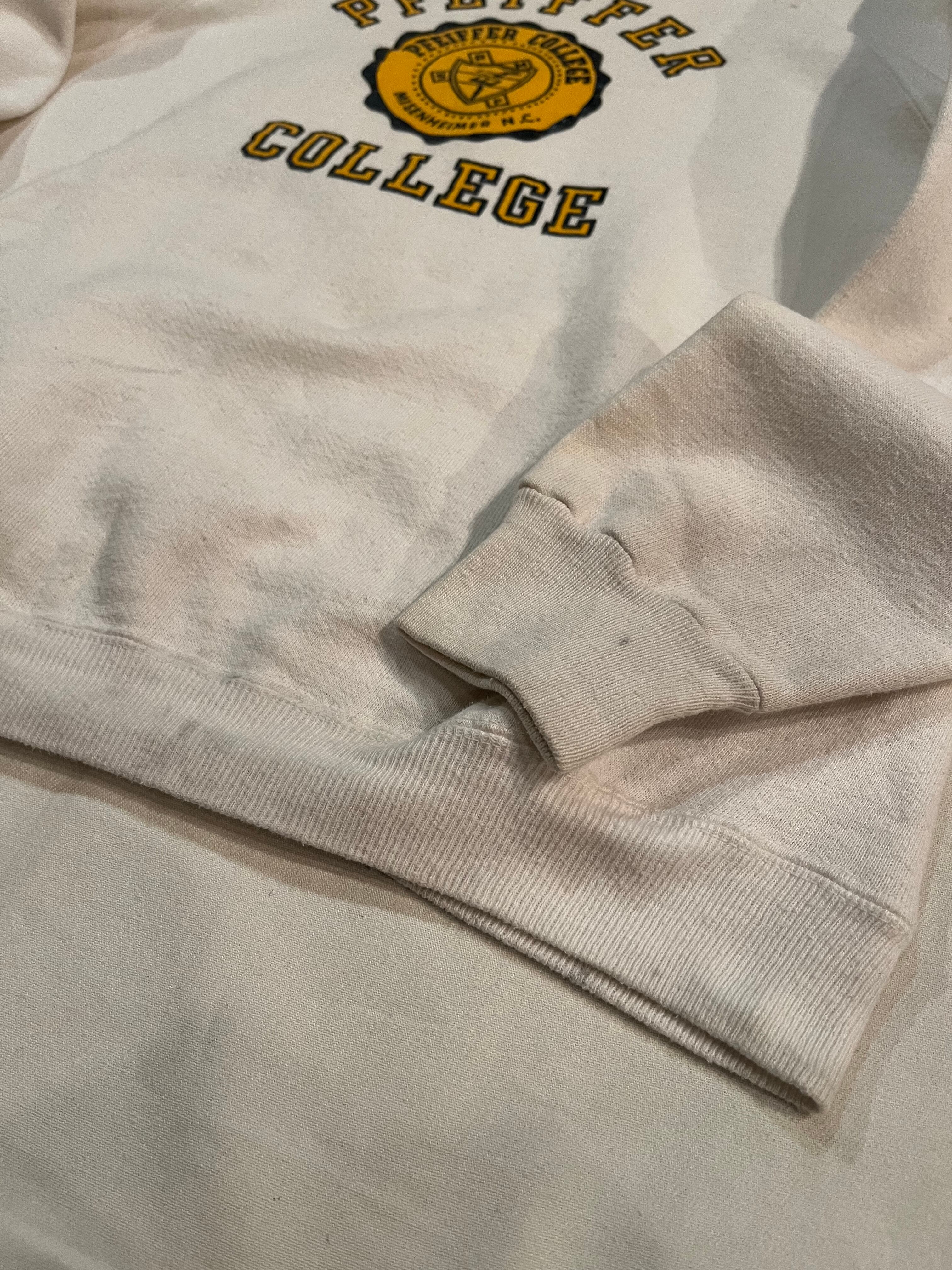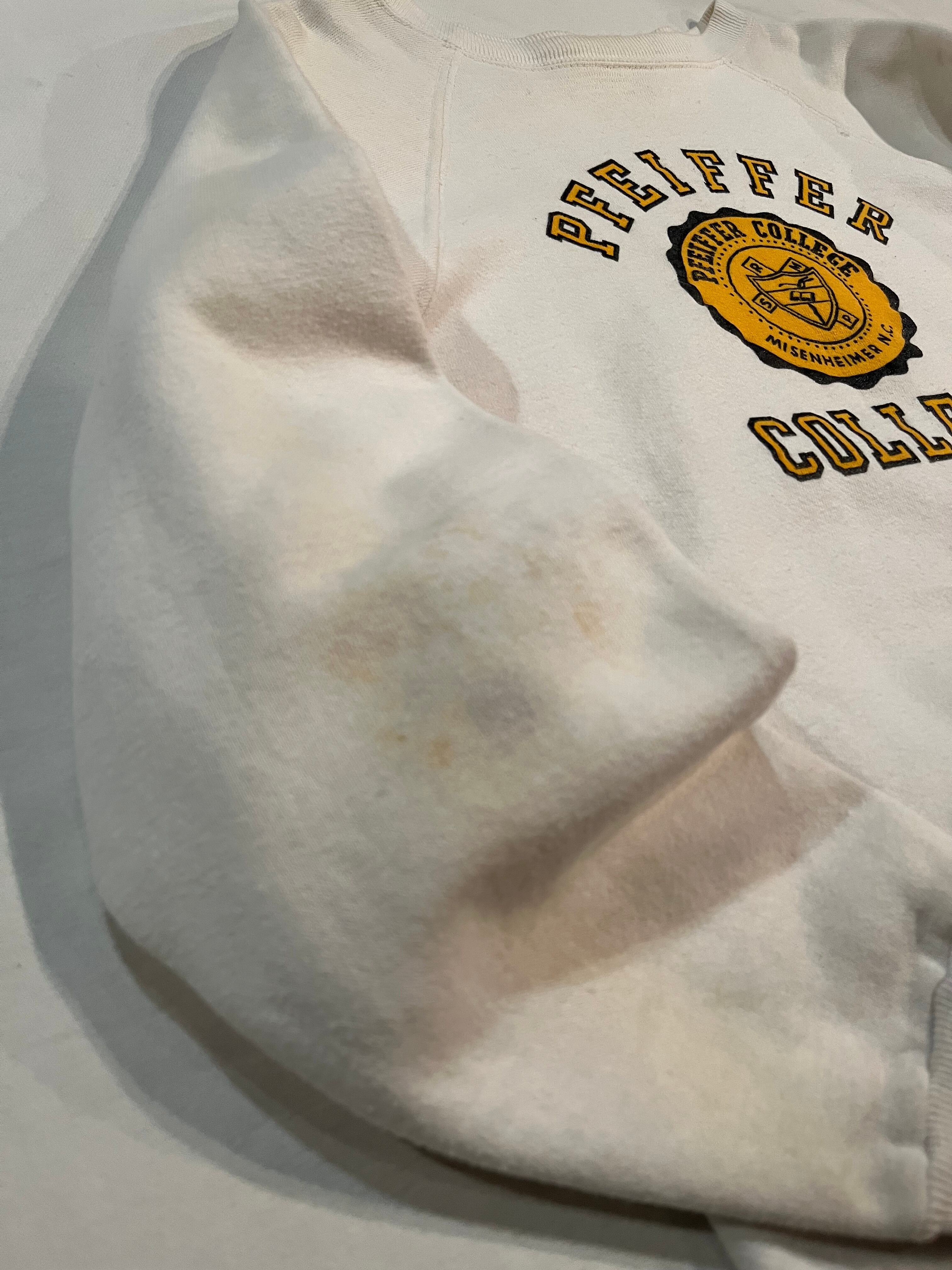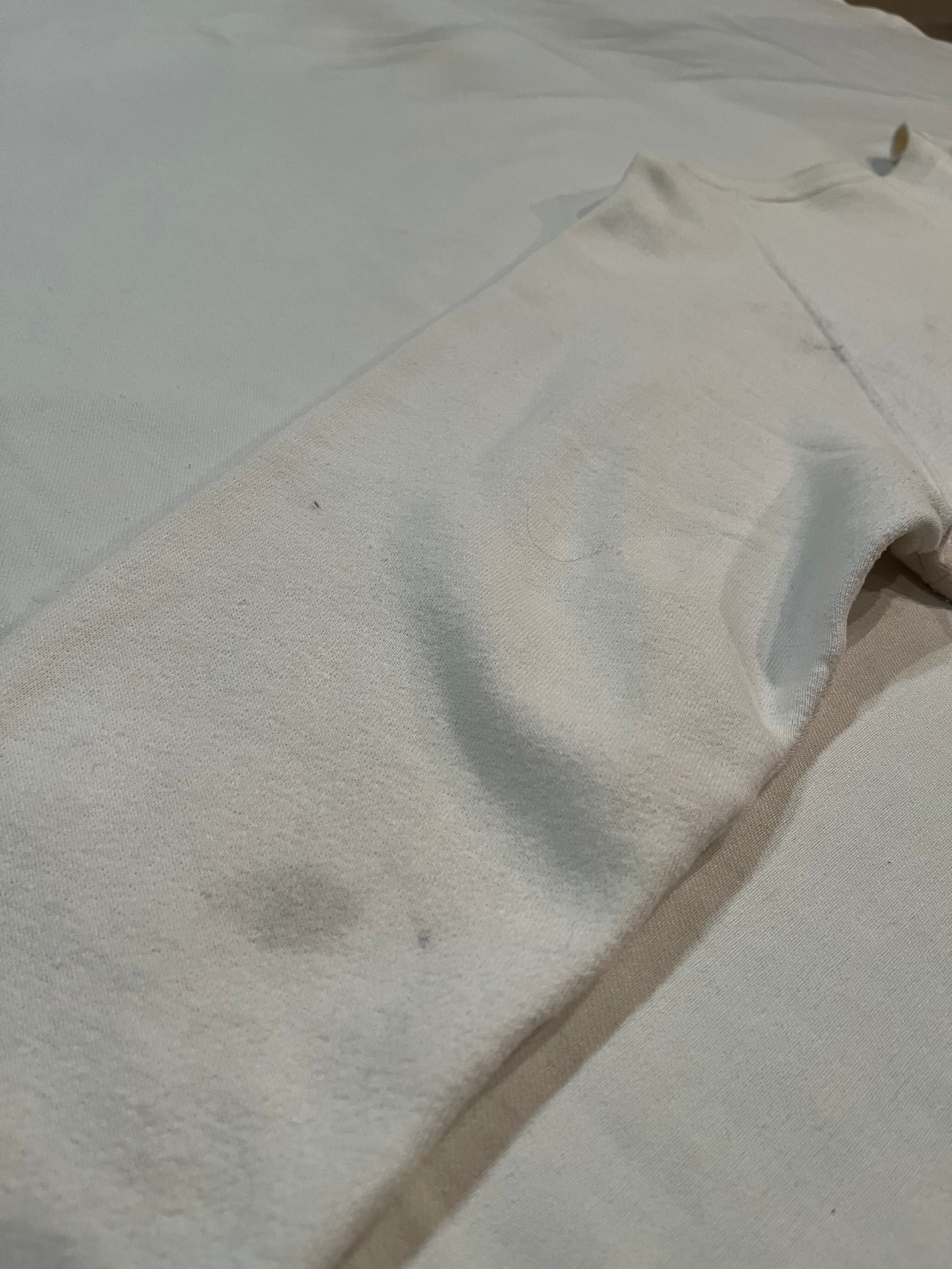 ホワイトカラーにイエローのカレッジプリントでバランスの取れたヴィンテージスウェット